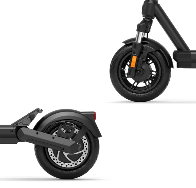 Einstellbare Trommelbremse vorne, elektromagnetische Bremse (Rekuperation) und Scheibenbremse hinten; 2 Bremshebel;